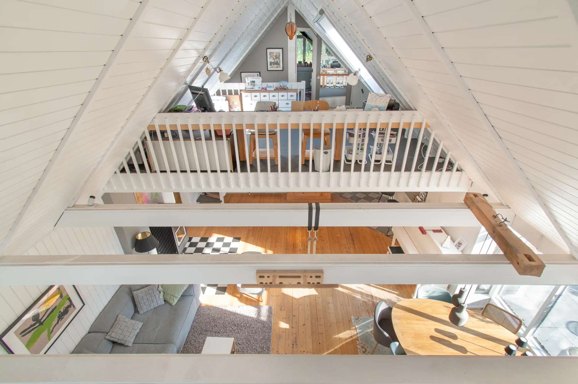 - zwei offene Galerien mit Blick in den Wohnbereich, die sich ideal als Arbeitsbereich, Leseecke oder Atelier eignen.