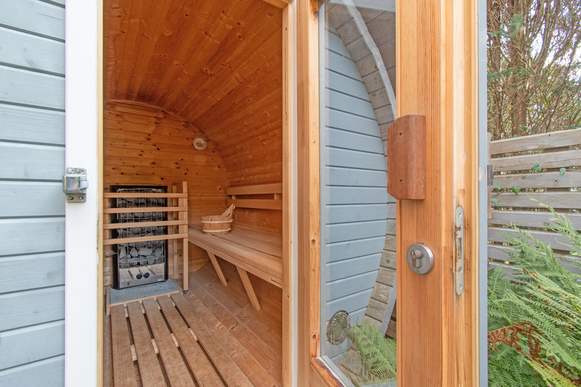 - Fass-Sauna im Garten für entspannte Stunden inmitten der Natur
