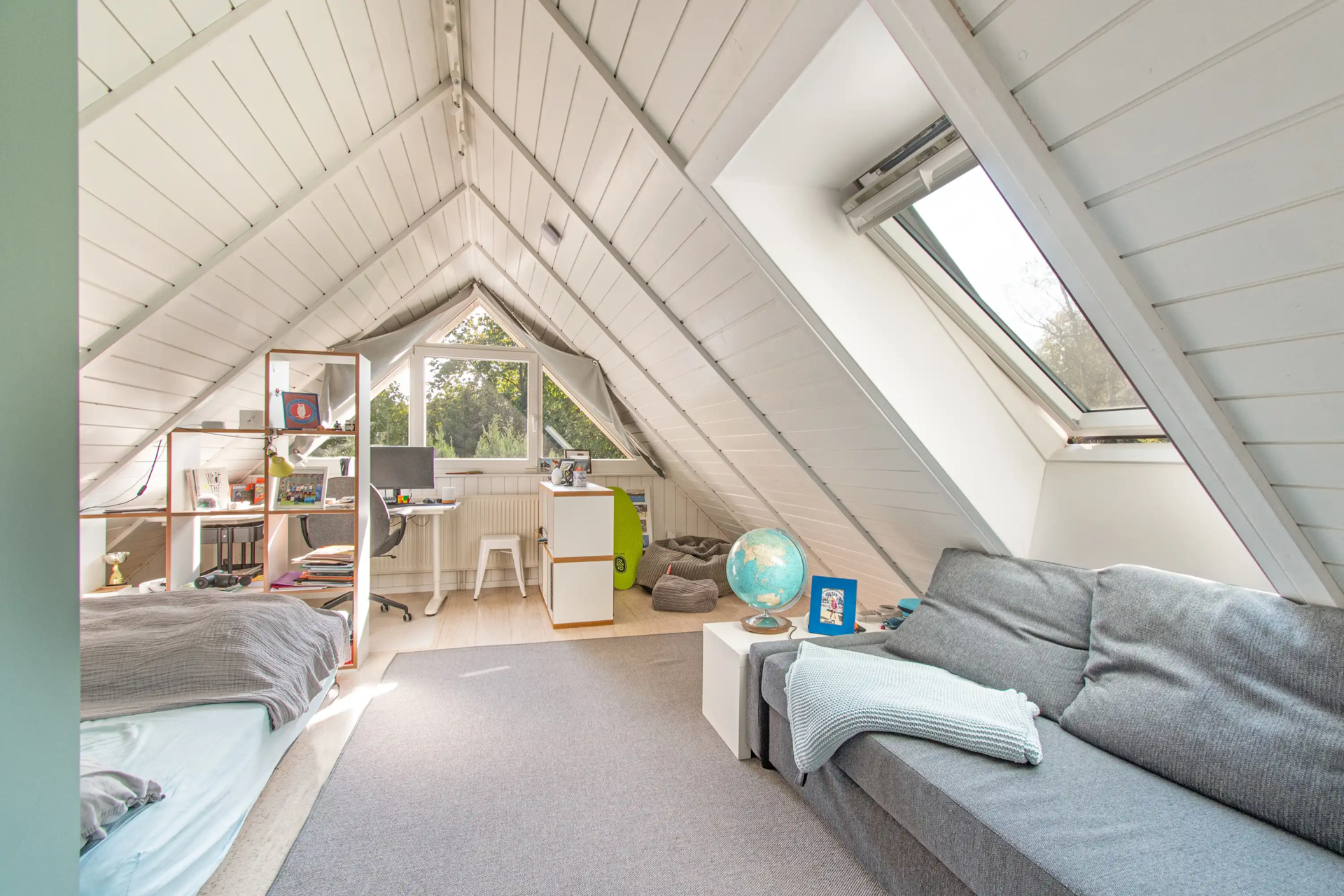 Das dänische Holzhaus wurde 1993 erbaut, 2017 um einen Anbau erweitert und modernisiert. Im Zuge dessen wurde das Dach vollständig erneuert, gedämmt und mit einer neuen Gaube ausgestattet. Dabei wurde der Dachüberstand durch Versetzen eines Fensters in den Wohnraum integriert und bietet nun eine herrliche Kuschelgalerie, die über eine Treppe aus dem Wohnbereich zu begehen ist. Der circa 45 m2 große Anbau beheimatet seitdem den Elternschlaftrakt inklusive Ankleide und großzügigem Badezimmer.
